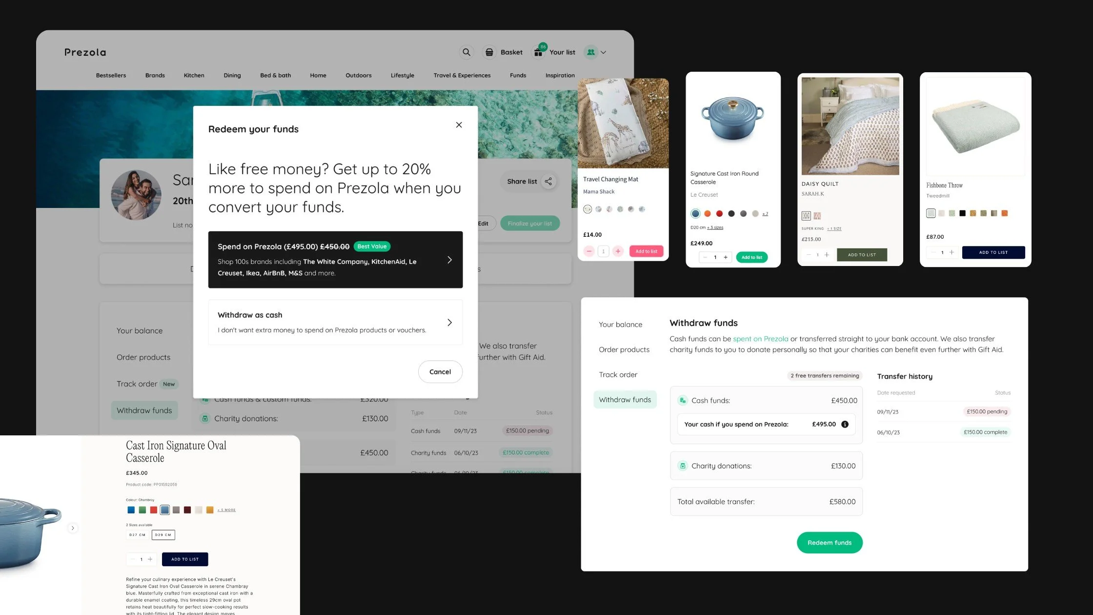I stepped in to design and deliver UX initiatives across Cambium's products — Prezola, The Wedding Shop, Wedding Present Company, and LittleList. Two key projects: an automated Cash to Product incentive that turned dormant post-wedding funds into £100K+ in exchanges — replacing a manual process that relied on customer support — and a Product Variants rollout across all four platforms that shifted shopping behaviour, with PDP views up 45–68% and ATL value following.